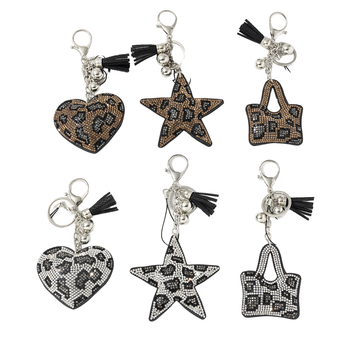 Venta al por mayor diamante leopardo llavero con corazón estrella bolsa forma cristal Rhinestone Bling cuero llavero gato Animal perro patrones